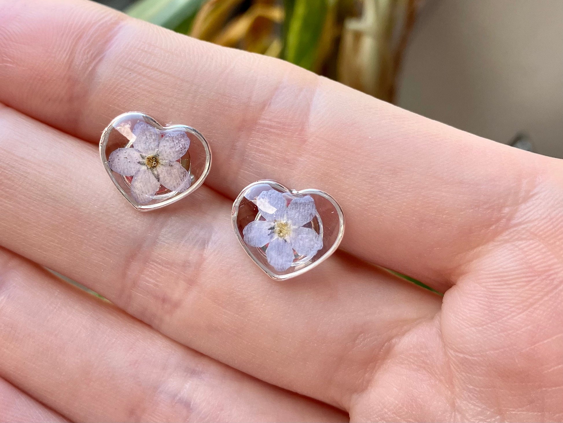 Forget me not solid silver love heart stud earrings. 13mm small studs real pressed flower studs.