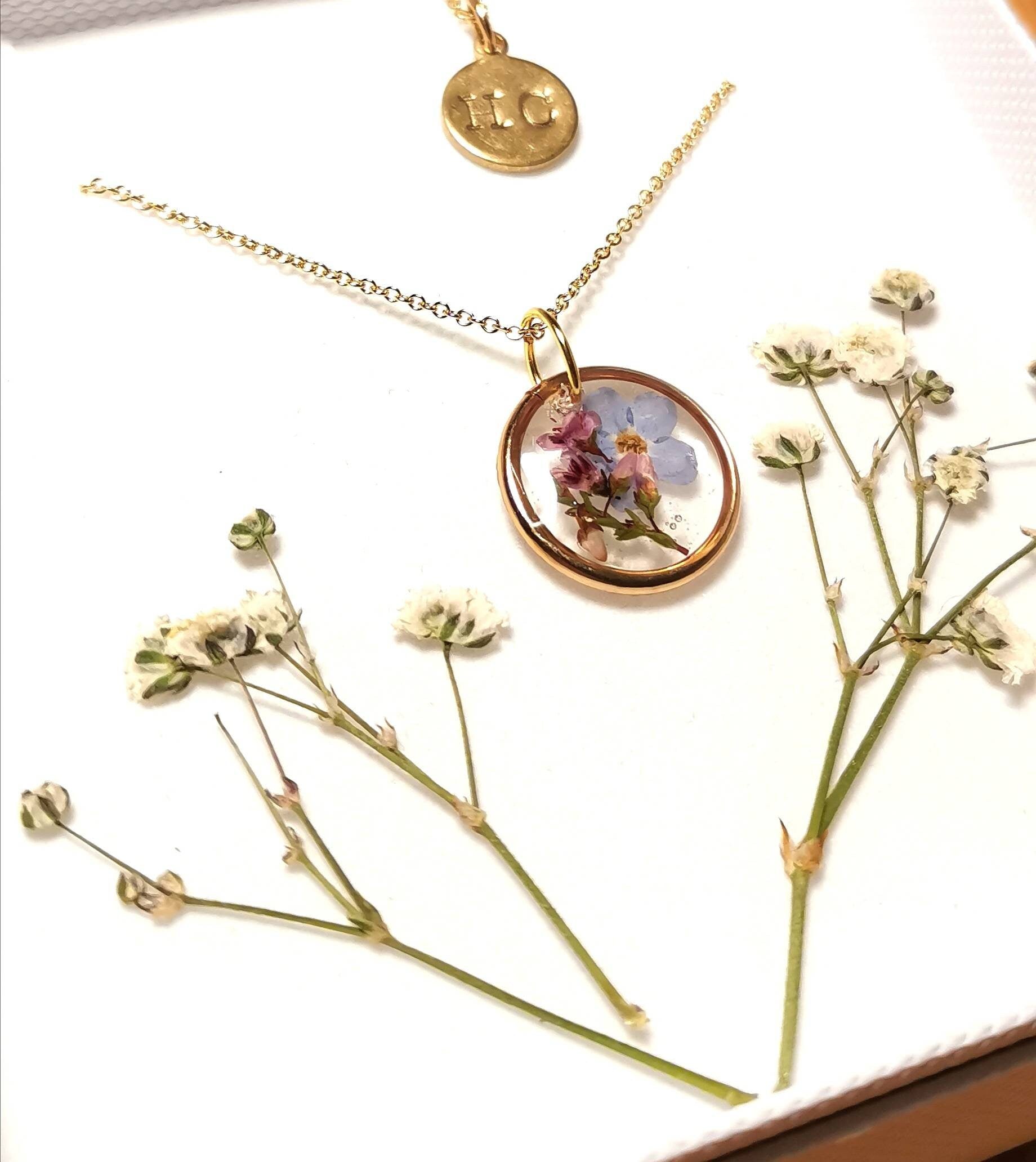Personalised Forget me not, Heather real pressed flower dainty minimalist circle 16mm gold plated pendant necklace on 14k gold fill chain.