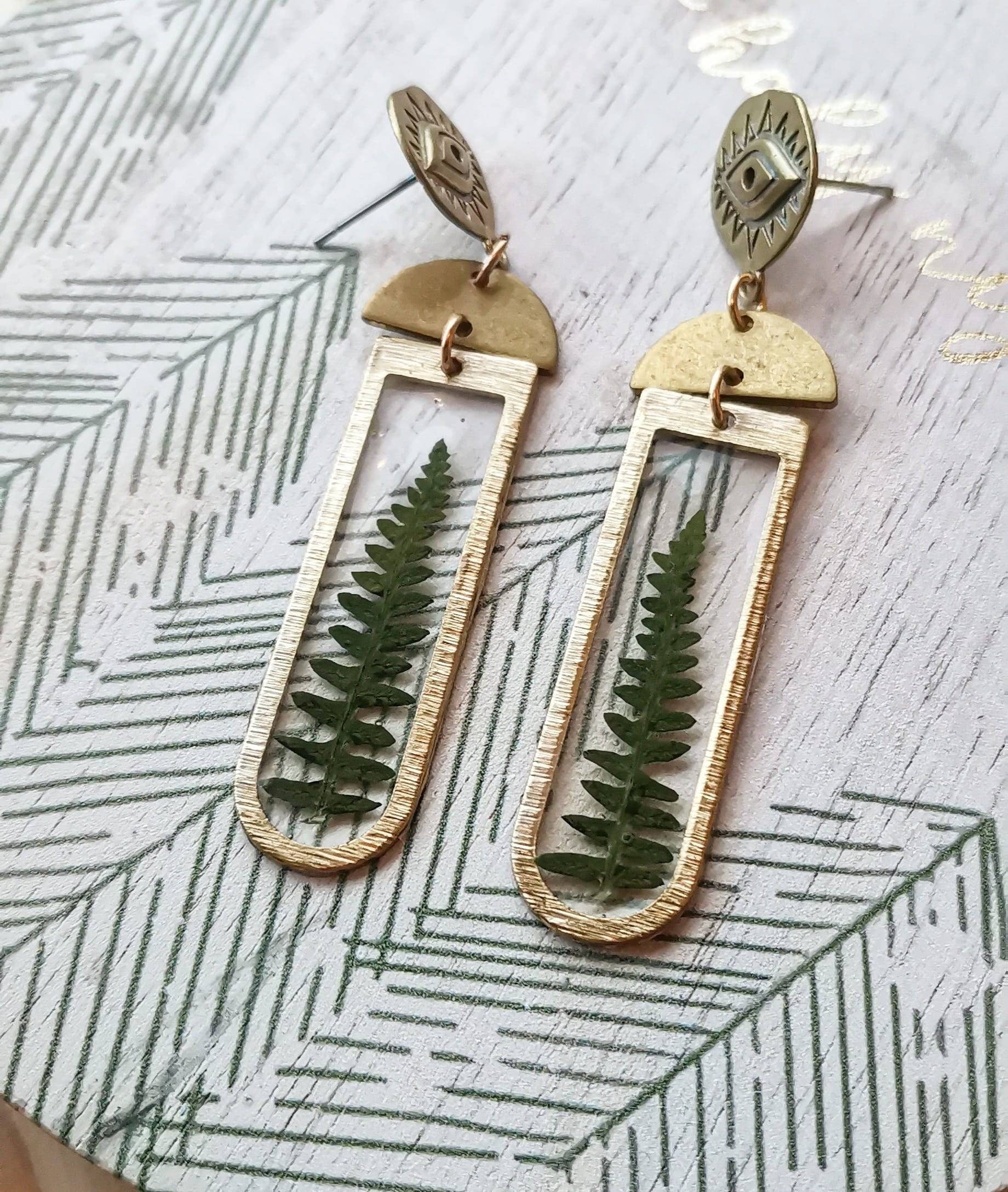 Real pressed fern leaf resin and evil eye earrings, eco friendly gift idea, plant lover, real pressed flowers, boho chic jewellery